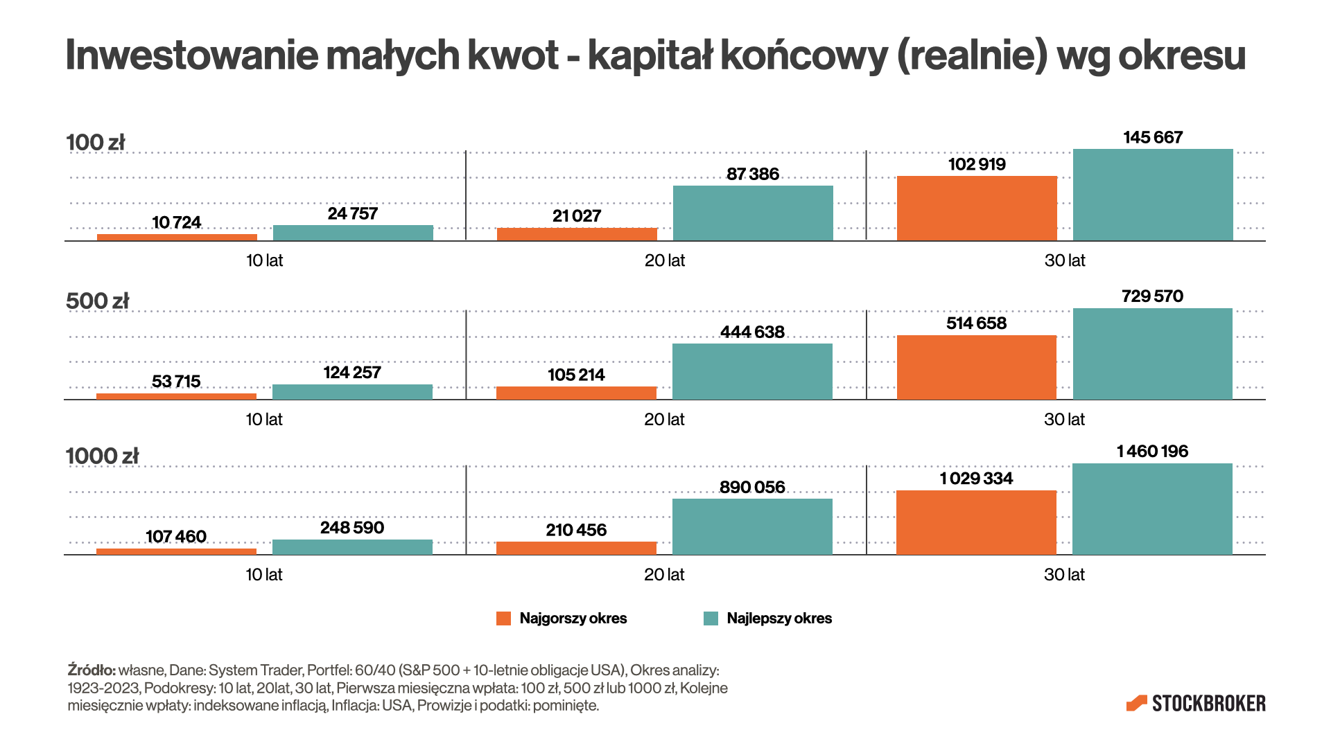 Młodzi Polacy (18-35 lat) oszczędzają średnio 1000 zł miesięcznie, a połowa z nich oszczędza co najwyżej 500 zł miesięcznie. Inwestując takie -pozornie- małe kwoty historycznie można było z powodzeniem uzbierać na „czarną godzinę”, wkład własny na mieszkanie, otwarcie biznesu, a nawet prywatną emeryturę. Inwestując w horyzoncie 10 lat, w przeszłości w zdecydowanej większości przypadków udawało się pokonać inflację. A w horyzoncie 20 lub 30 lat – zawsze, nawet w pechowych okresach. Sposób inwestowania małych kwot zależy od celu inwestycji, wiedzy czy horyzontu inwestycyjnego.