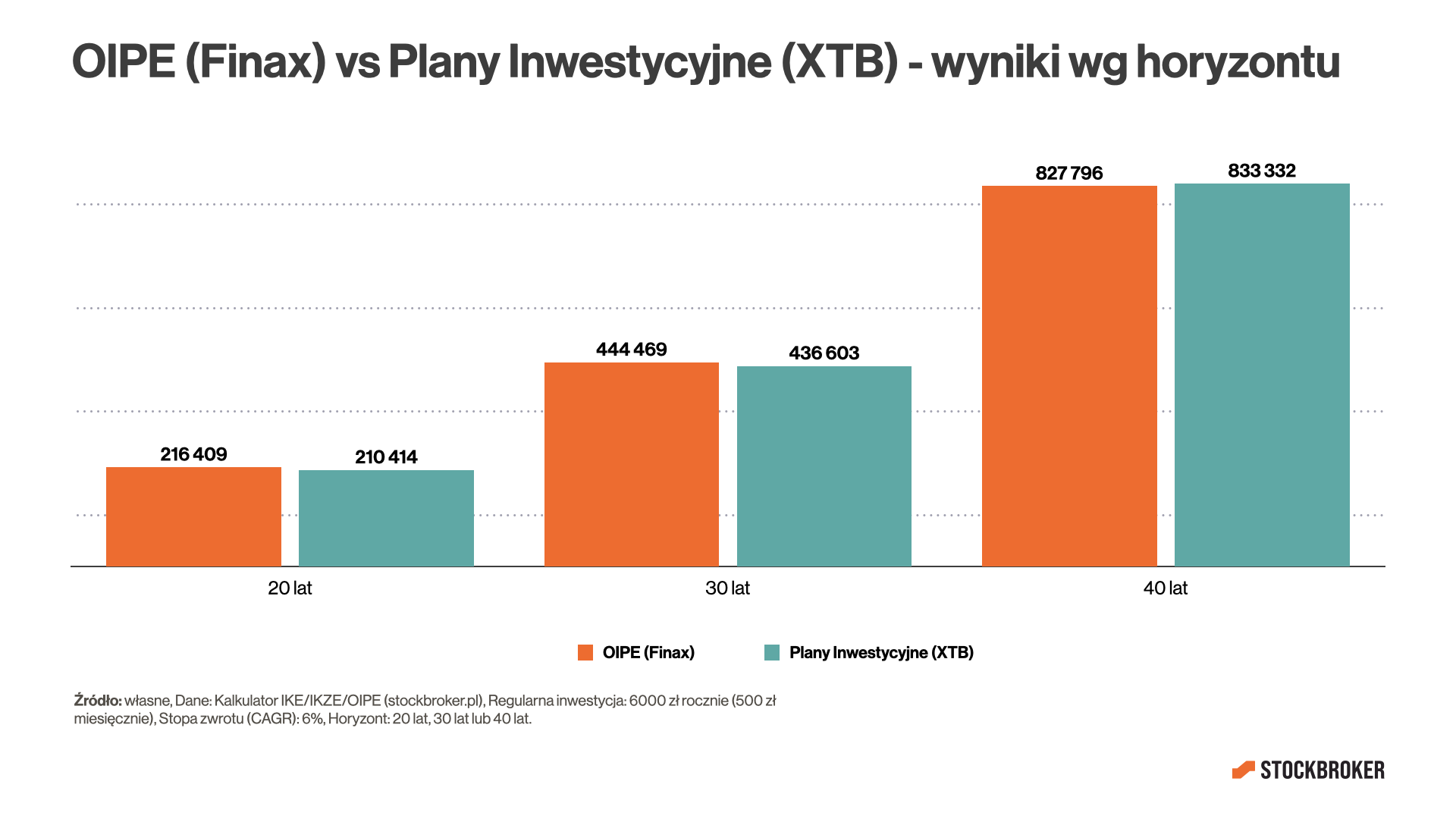 Ale wyniki zależą też od stopy zwrotu. Załóżmy, że inwestujemy 6000 zł rocznie (czyli 500 zł miesięcznie) w horyzoncie 20 lat. Już wiemy, że przy stopie zwrotu 6% rocznie lepiej wypada Finax. Przy wyższych zwrotach, na przykład 8%, tym bardziej wygrywa Finax. A jakie byłyby wyniki, gdyby stopa zwrotu była niższa? Gdyby średnioroczny zwrot wynosił 5% lub 4% Finax nadal jest górą. Dopiero, gdyby roczny zysk miał wynosić 3%, lepiej wypadłby XTB. Chociaż historycznie tak niskie stopy zwrotu należały do rzadkości. Wniosek jest taki, że Finax opłaca się tym bardziej, im krótszy horyzont oraz im wyższa stopa zwrotu. Oczywiście trzeba wziąć pod uwagę, że w razie wypłaty z OIPE przed osiągnięciem „wieku korzyści podatkowych”, trzeba będzie zapłacić podatek, a kosztów zarządzania nikt nam już nie zwróci. Polecam Wam też zrobić własne obliczenia za pomocą “Kalkulatora IKE/IKZE/OIPE”.