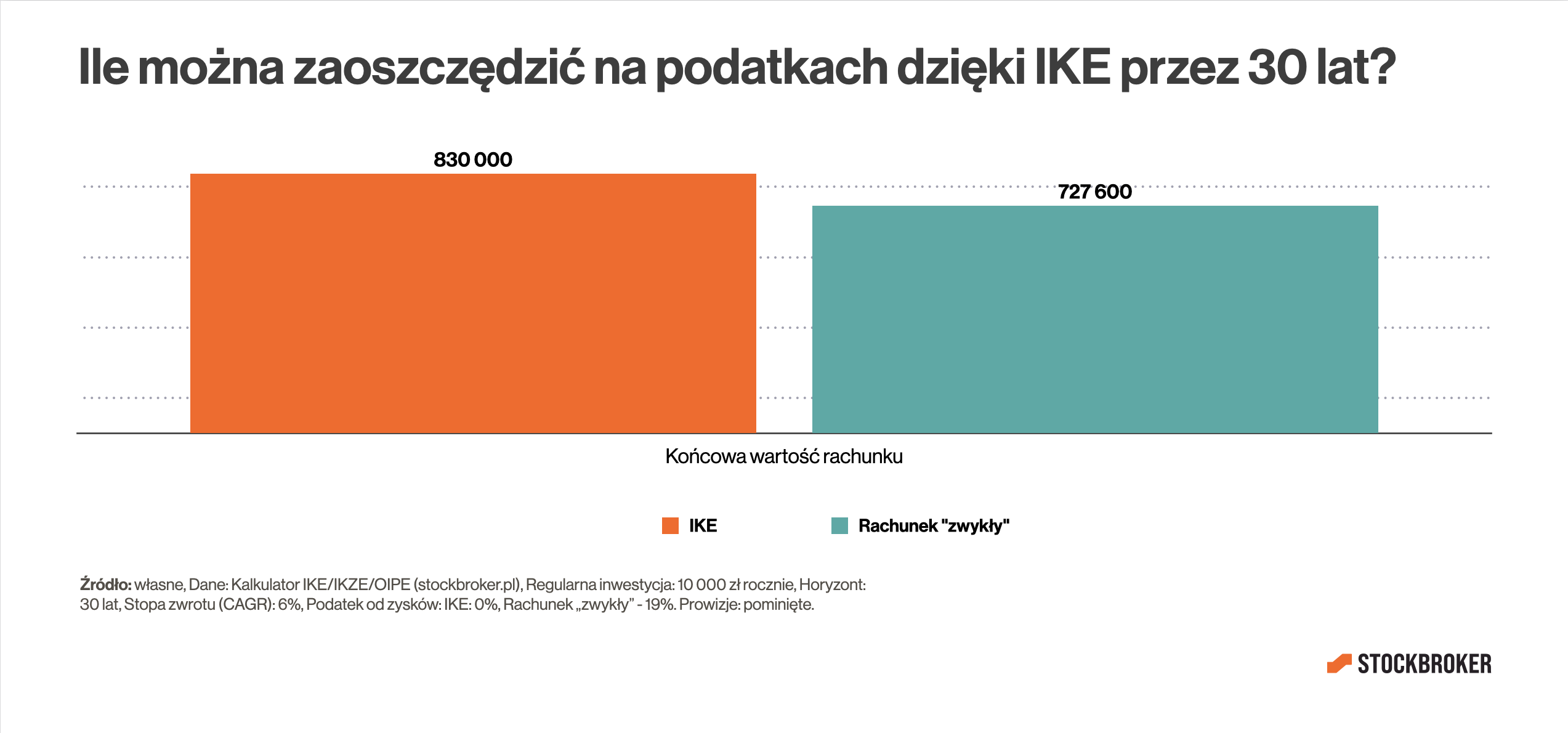 Jednym z najczęściej wskazywanych celów inwestycyjnych jest emerytura. W dążeniu do niego mogą szczególnie przydać się konta emerytalne, IKE, IKZE i OIPE, dzięki którym można oszczędzać na podatkach. Przykładowo, zakładając że inwestujemy przez IKE 10 000 zł rocznie, przy założeniu rocznej stopy zwrotu 6%, po 30 latach zgromadzimy 830 000 zł, podczas gdy przez rachunek „zwykły” mielibyśmy około 100 000 zł mniej, bo tyle poszłoby do fiskusa.