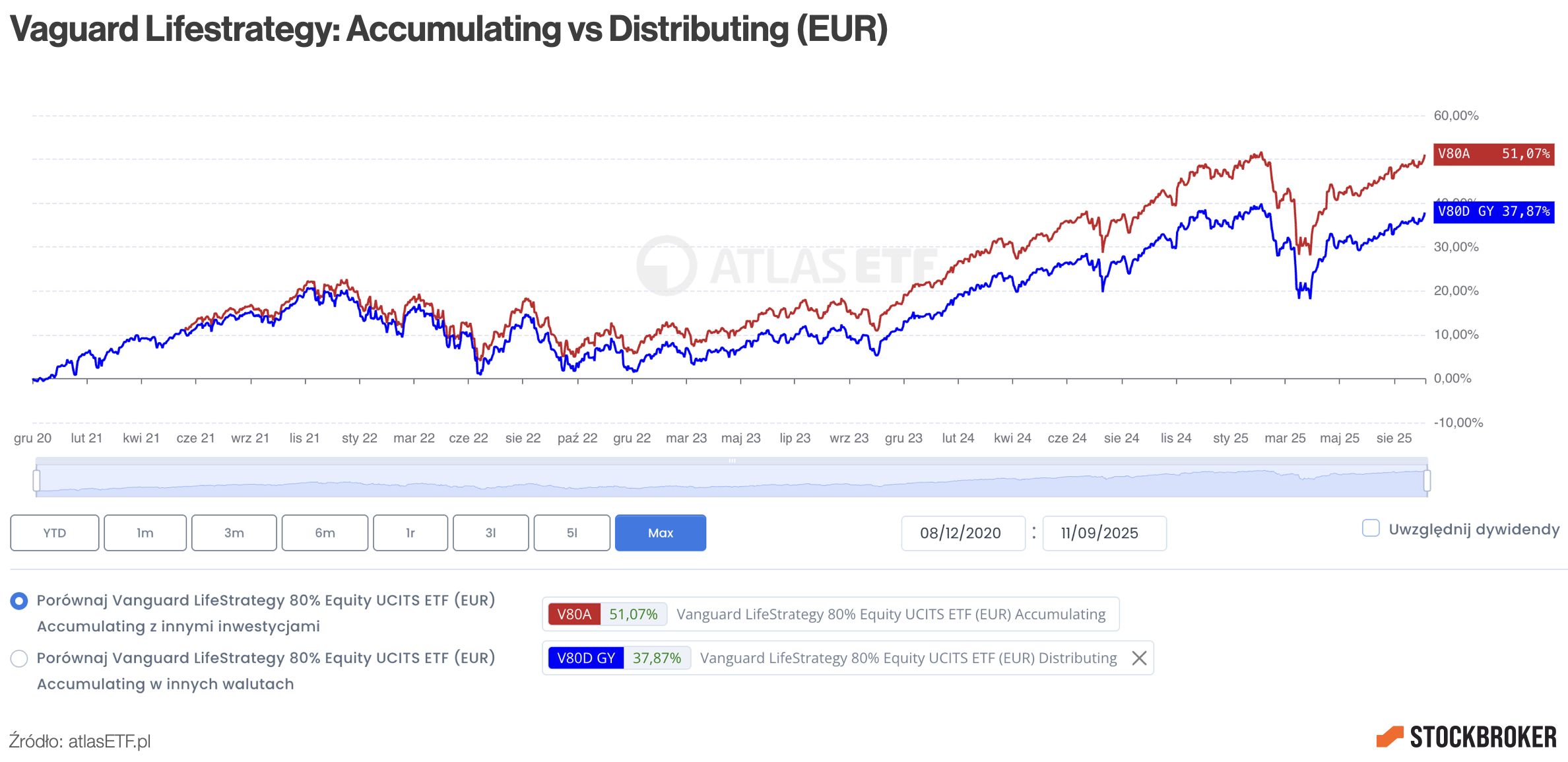 Spójrzcie na przykład funduszu Vanguard LifeStrategy. Jednostka wypłacająca dywidendy (niebieska linia) na przestrzeni prawie 5 lat ma stopę zwrotu niższą o około 13 punktów procentowych niż jednostka akumulująca (czerwona linia). Ta różnica to właśnie wypłacone dywidendy, które trafiają do kieszeni inwestora. Gdyby je doliczyć, obie stopy zwrotu byłyby takie same.