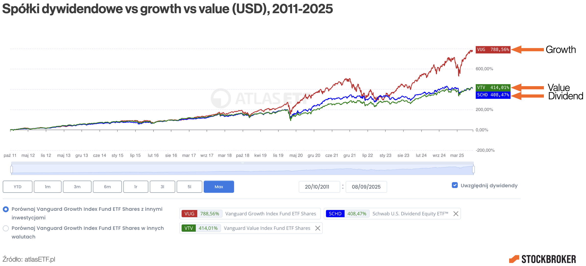 Weźmy na przykład trzy ETF-y z rynku amerykańskiego, które mają długą historię, więc łatwo je analizować. Mamy Vanguard Value Index Fund ETF Shares — to spółki „value”, czyli dojrzałe firmy. Potem Vanguard Growth Index Fund ETF Shares — to spółki wzrostowe, czyli te, które się rozwijają. I na koniec Schwab US Dividend Equity, czyli spółki o wysokiej stopie dywidendy. Jak spojrzymy na ostatnie 14 lat, to wyniki funduszy na spółki value i growth były różne. Natomiast fundusz SCHD, czyli ten na spółki dywidendowe, miał stopę zwrotu bardzo zbliżoną do funduszu value. To moim zdaniem dobrze pokazuje charakter spółek dzielących się hojnie dywidendą.