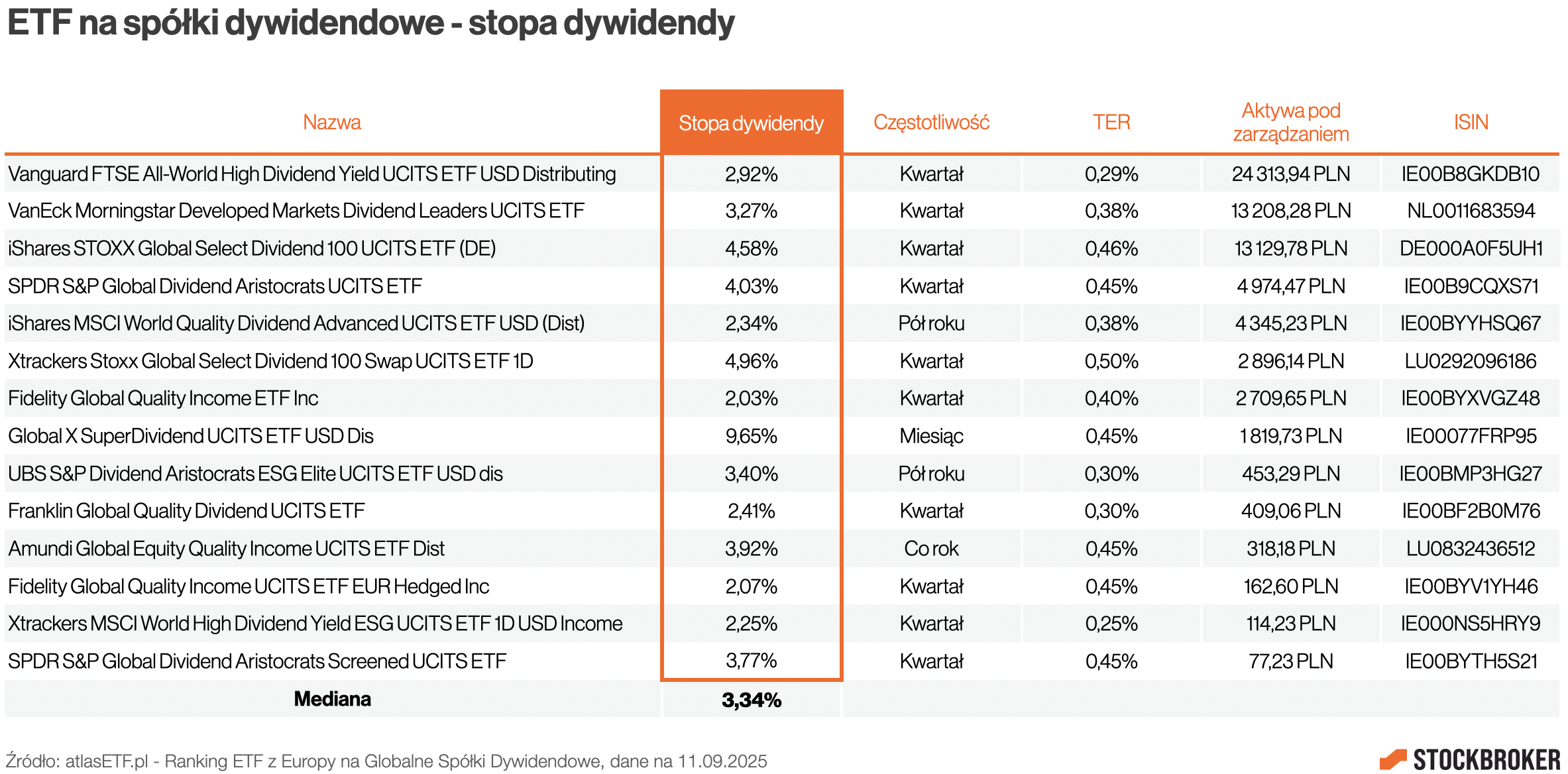 Jak inwestować w spółki dywidendowe? Prosta i rozsądna zasada mówi tak: im mniej się znamy, tym bardziej warto dywersyfikować. Najlepiej zrobią to ETF-y, które inwestują w cały koszyk spółek z różnych rynków na świecie. Dzięki temu nie ryzykujemy, że akurat rynek, który wybraliśmy, będzie sobie radzić gorzej. Takie fundusze łatwo znajdziecie na przykład na atlasETF.pl. Polecam ranking ETF-ów z Europy na globalne spółki dywidendowe. Na ten moment jest tam 17 funduszy. U brokerów najłatwiej dostępne są te z największymi aktywami. A trzy największe to: