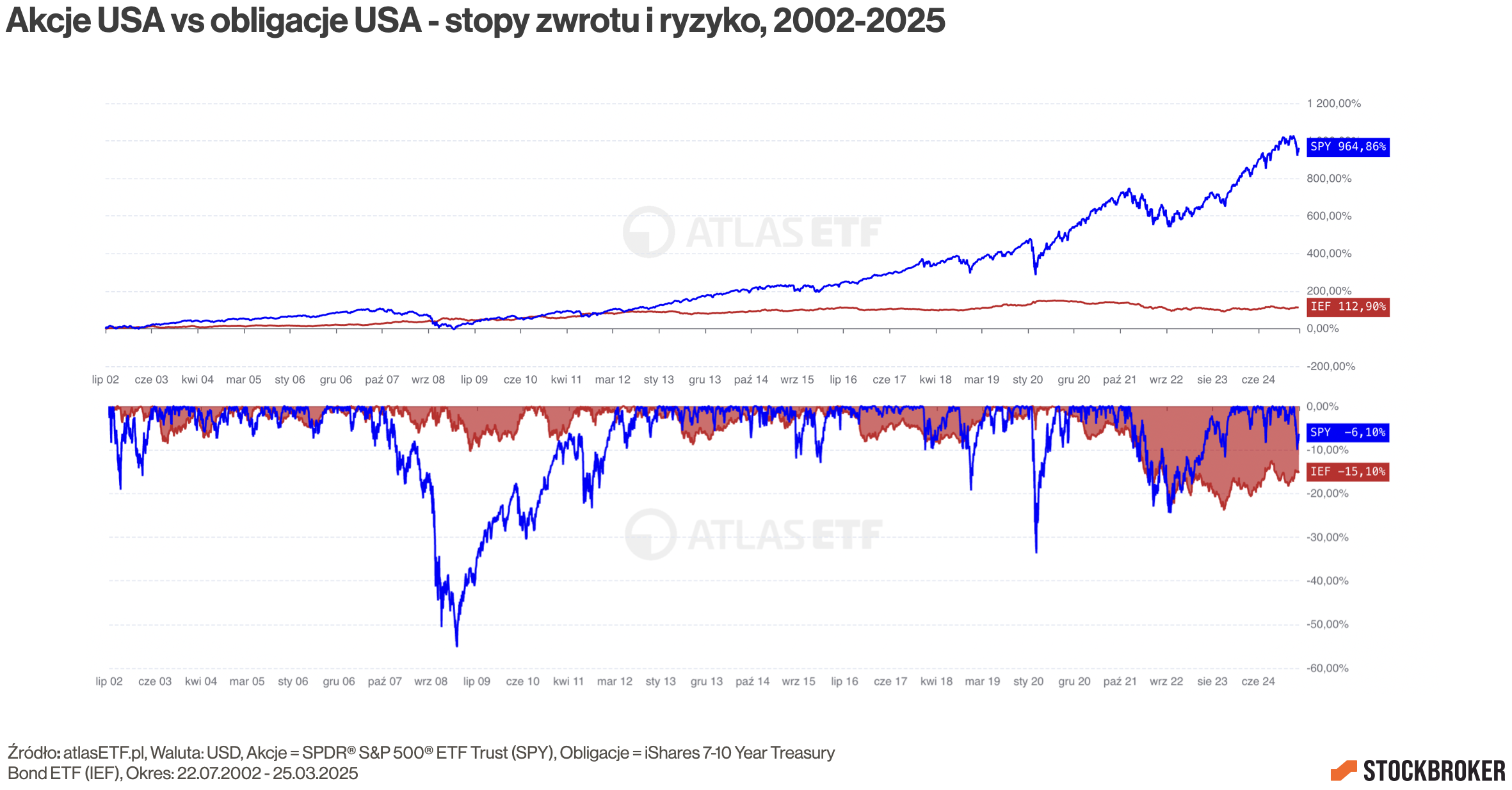 W okresie 2002-2025 obligacje USA dały zarobiły 113%. Jak na tak długi okres to niewiele – to 10 razy mniej niż akcje. Jednak portfel obligacji pozwolił ochronić się przed inflacją, a zmienność była dużo mniejsza niż akcji. Spadki przeważnie sięgały co najwyżej -10%. Zresztą, jeżeli wydłużymy horyzont i spojrzymy na ostatnie 40 lat, wygląda to jeszcze lepiej. W okresie 1980-2020, 10-letnie obligacje amerykańskie dały zarobić średniorocznie 8% w ujęciu nominalnym, pokonując inflację przeciętnie o 5%. Czyli zarobiły niewiele mniej niż akcje. A przy tym maksymalnie obsunięcie przez cały ten czas nie przekraczało -10%. I to jest piękno obligacji.